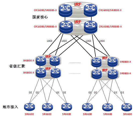 國家級廣域網(wǎng)由于地域上覆蓋的廣闊性,對網(wǎng)絡(luò)設(shè)備的可靠性和安全性要求高,SR8800系列可以作為國家核心和省級匯聚節(jié)點(diǎn)。為了保證網(wǎng)絡(luò)的安全性,在國家核心、省級節(jié)點(diǎn)采用上下行設(shè)備分開的設(shè)計(jì)架構(gòu);省級和地市節(jié)點(diǎn)同時(shí)作為城域網(wǎng)匯聚接入、專線匯聚、窄帶接入。