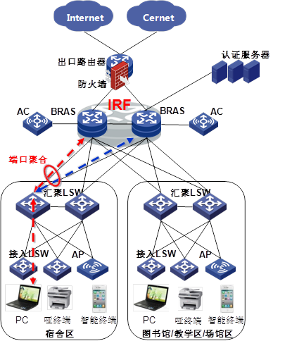 H3C BRAS支持iTA(智能靶向計(jì)費(fèi)),通過訪問的目的地址來區(qū)分不同的業(yè)務(wù)流量,提供不同的帶寬、計(jì)費(fèi)、Qos策略等,滿足高校用戶對訪問校內(nèi)網(wǎng)、Cernet、Internet等不同速率不同計(jì)費(fèi)策略要求;提供有線無線統(tǒng)一認(rèn)證解決方案,通過大容量BRAS滿足海量用戶終端接入需求,滿足無線終端的移動(dòng)性需求;BRAS IRF功能在滿足冗余熱備的基礎(chǔ)上可以簡化運(yùn)維工作。